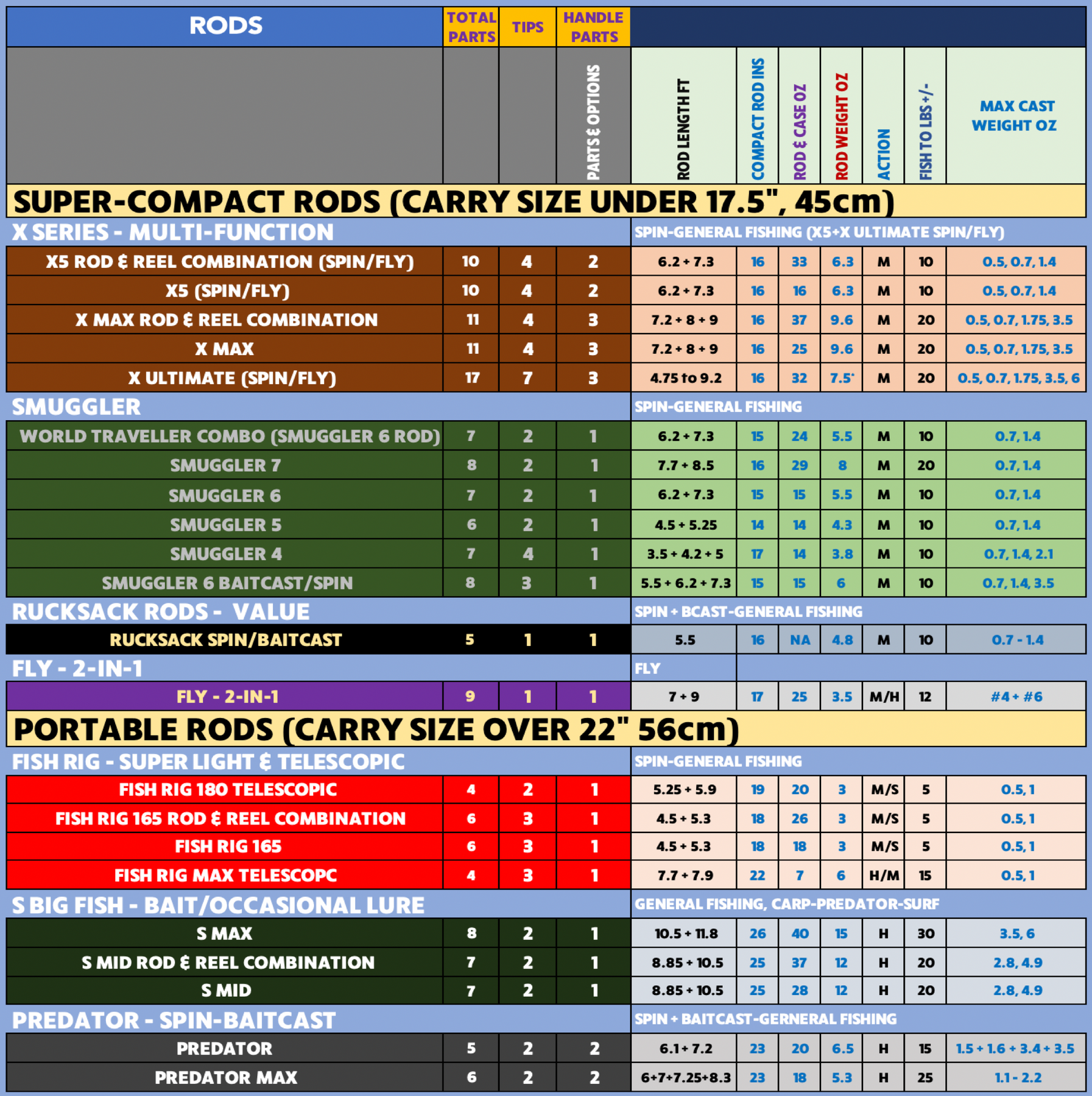 · COMPACT ROD LENGTHS & WEIGHTS. The super compact rod sections measure 15 ¾”, 40.5cm, and weigh 6 1/3oz, 180g, the rod case measures 16 ½”, 42cm, and weighs with both reels weighs 33oz, 928g.