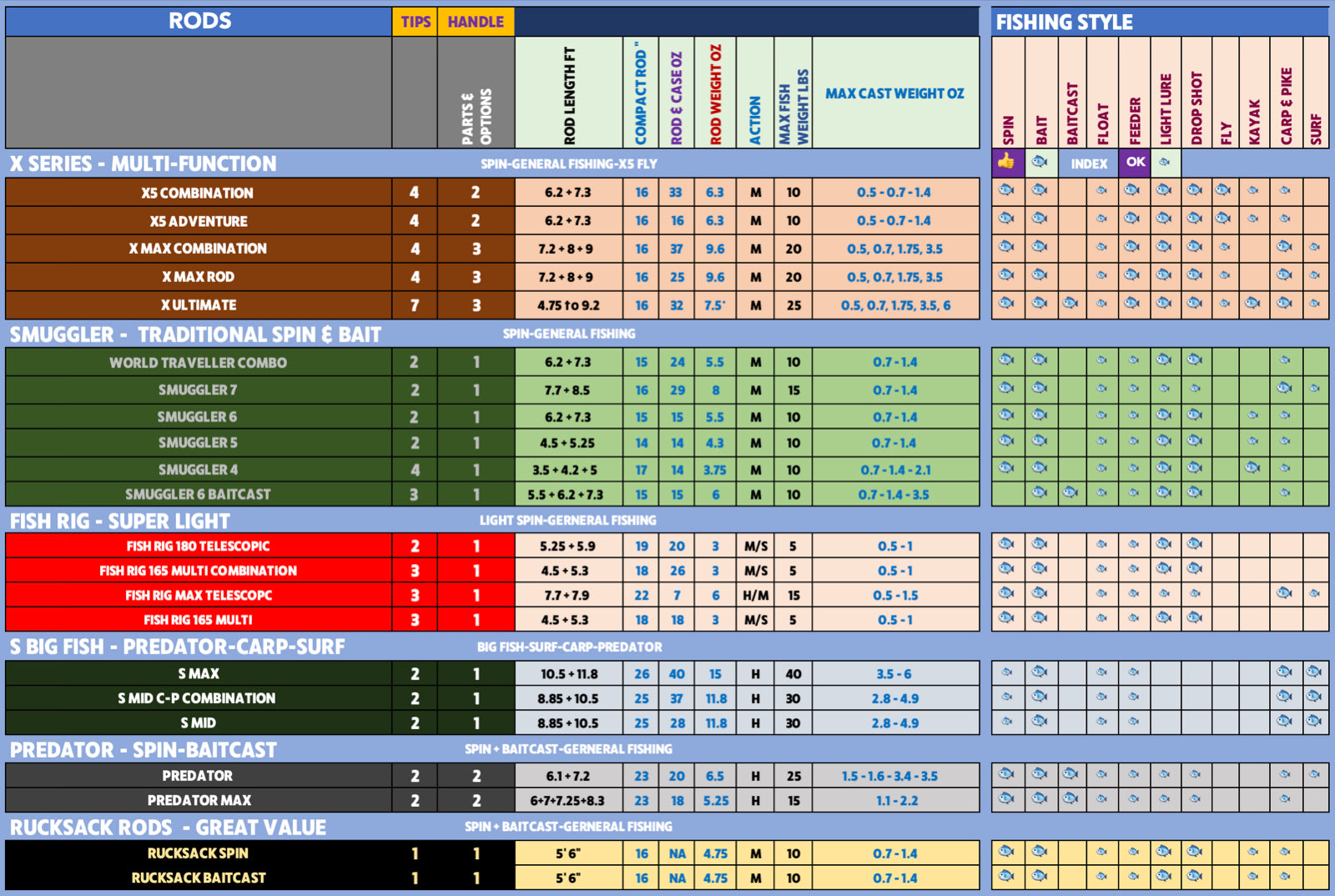 X Ultimate 25-IN-1 Spin-Baitcast-Fly Travel Fishing Rod Limited Edition. 25 Fishing Rod Options. Max 280cm 9’2” Min 107cm 3’6”. Cast-Spin Micro Trigger 7 tips + 3 Handles. (there are 37 fishing rod options using the butt extension).